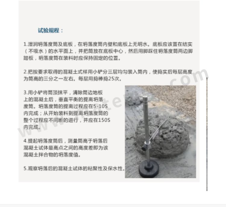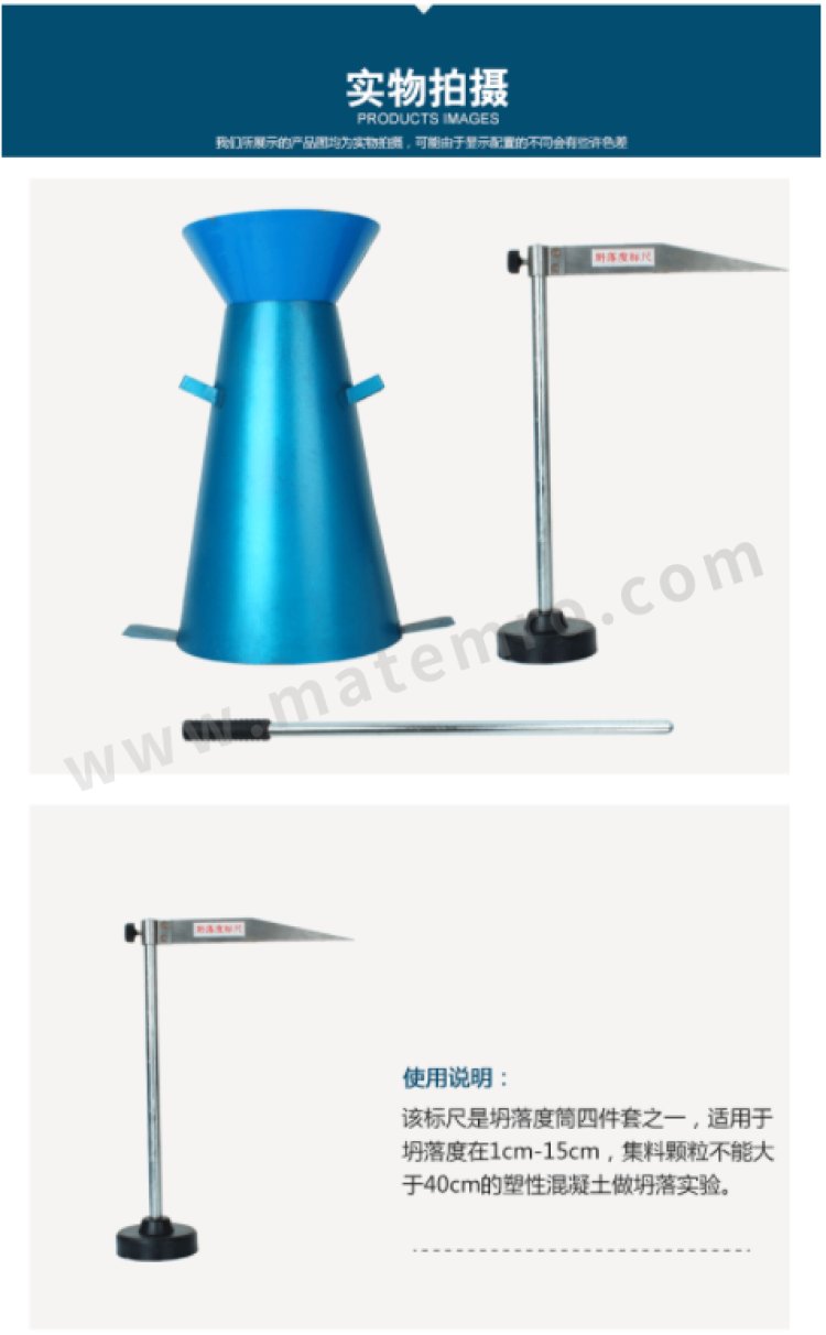 - 一套包含:塌落度桶,坍落度筒捣棒标尺,漏斗等
